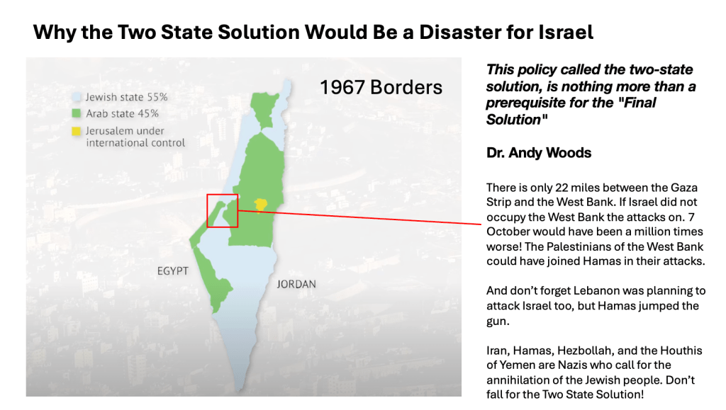 Why the Two State Solution Would Be a Disaster for Israel Stephanie Islam, Israel and Palestine, Uncategorized February 19, 2025February 19, 2025 1 Minute I felt compelled to make this graphic. Please save it off and share it with your friends and family! Share this: Share on X (Opens in new window) X Share on Facebook (Opens in new window) Facebook Like Loading... Related Published by Stephanie View all posts by Stephanie Published February 19, 2025February 19, 2025